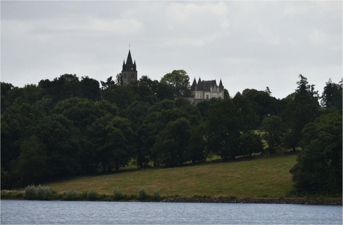 Dès le départ, et durant toute notre matinée nous longeons le lac formé par une retenue d’eau sur la Vilaine, ce fleuve qui rejoint la mer à la Roche Bernard (44). Le chemin qui surplombe le lac et nous offre une vue dégagée sur l’eau miroitante dans son écrin de douces collines, me ravit. Sur l’autre rive, nous serions en Mayenne.