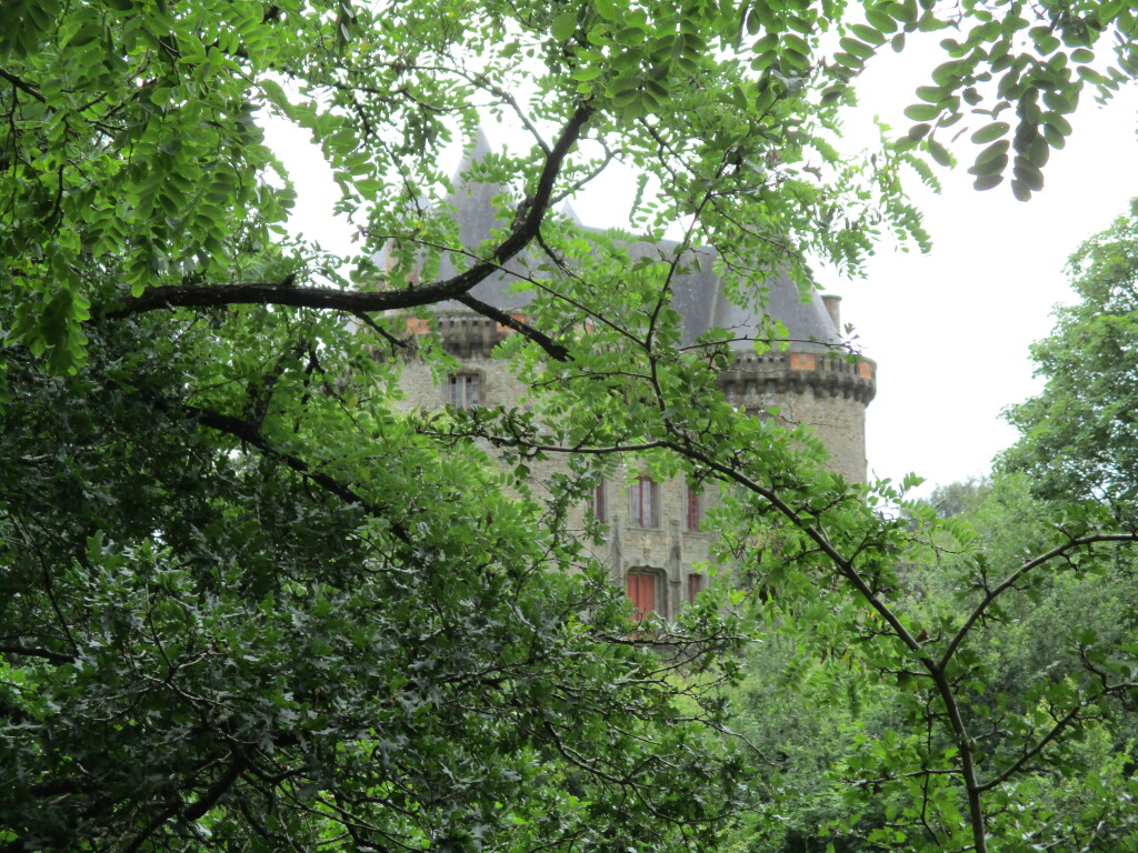 Deux des participants préfèrent revenir par un chemin plus plat mais passant devant une ferme ce qui oblige à se couvrir. Le reste de notre troupe reprend l’itinéraire vallonné ; nous ne parvenons pas à retrouver la route du matin ; cela nous permet de passer face au joli château (médiéval) de Landal. Une barrière de barbelés avec un panneau « propriété privée » nous empêcherait théoriquement de poursuivre sans rebrousser chemin. Après consultation, nous décidons collectivement de franchir cet obstacle de 200 mètres et retrouvons la route initialement prévue. Un adorable chien qui vient de se vautrer dans l’étang en contrebas nous dépasse en trombe et arrose toute la troupe. Il nous suivra presque jusqu’à notre point d’arrivée en nous mouillant copieusement à plusieurs reprises. Petit piquant de la journée.