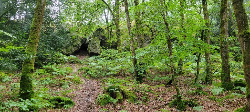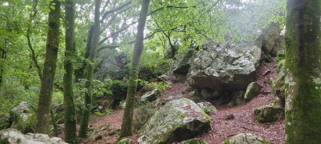 Nous étions 19 à braver les éléments et en fin de compte ce n’était pas désagréable, je dirai même plus, plutôt agréable. Beau parcours en sous-bois alternant chemins forestiers, sentiers herbus et petites grimpettes entre de belles pierres. Grâce à Alexandre(le bien heureux), notre mascotte à 4 pattes et aussi « à poil », nous avons pu observer deux chevreuils qui doivent aussi de leur côté, ce soir, raconter leur rencontre du jour !