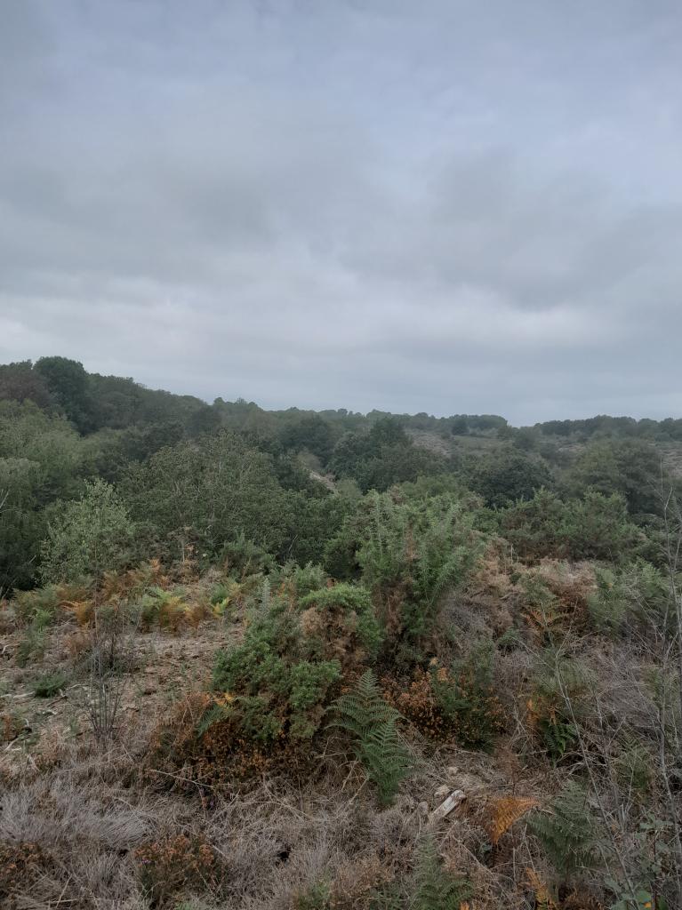 Nous cheminons tranquille jusqu'à une butte qui nous offre une première belle vue des environs et sur la lande qui se montre un peu agressive sur nos corps dénudés, les reporters dégainent caméra et drône, nous comprenons rapidement que tout ceci va prendre du temps mais la bonne humeur est de mise. Autre frein à notre progression, un passage hors sentier un peu escarpé qui passe au pied de jolis rochers couverts d'une belle mousse bien verte, une traversée de rivière qui nécessite de chercher le bon passage et une végétation dense qui ne manque pas de piquant.