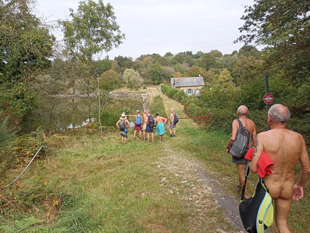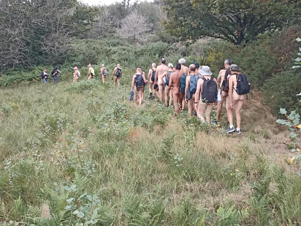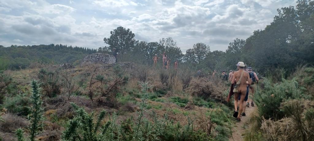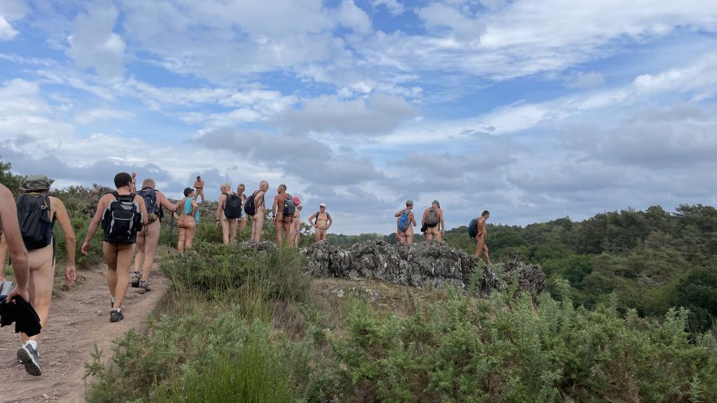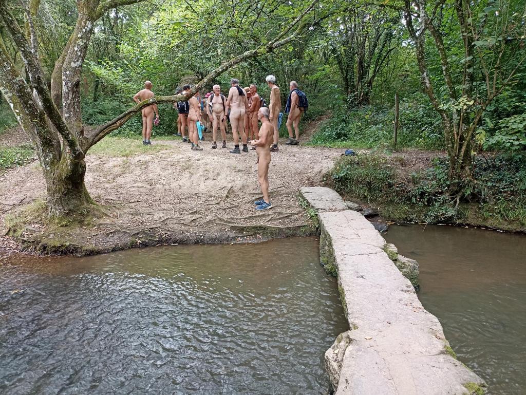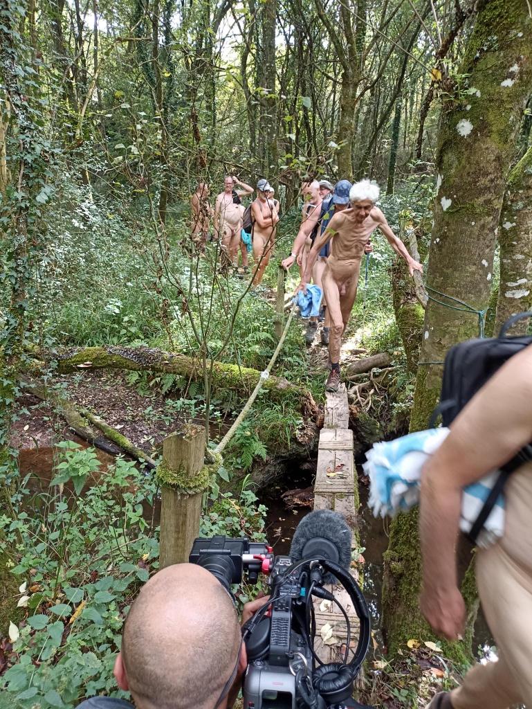 Pique nique sous le soleil dans un champs, joli passage en hauteur, puis à proximité du moulin une partie du groupe ne résiste pas à une baignade dans le ruisseau que nous venons de longer. Interviews et séances de tournage s'enchainent, une photo de dégradé de bronzage déjà fait en 2017 au même endroit est organisée et par Christian L puis nous ascensionons notre dernière falaise de schiste violet agrémenté de jolies mousses de différentes couleurs; la vue aérienne que nous procure cette vue est vraiment belle et inspire le caméraman qui filme avec le drone tout le groupe qui s'égosille à crier «le naturisme c'est l'aventure».