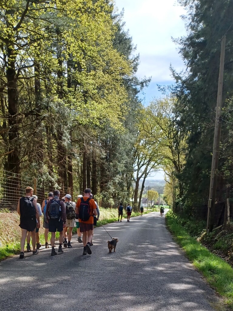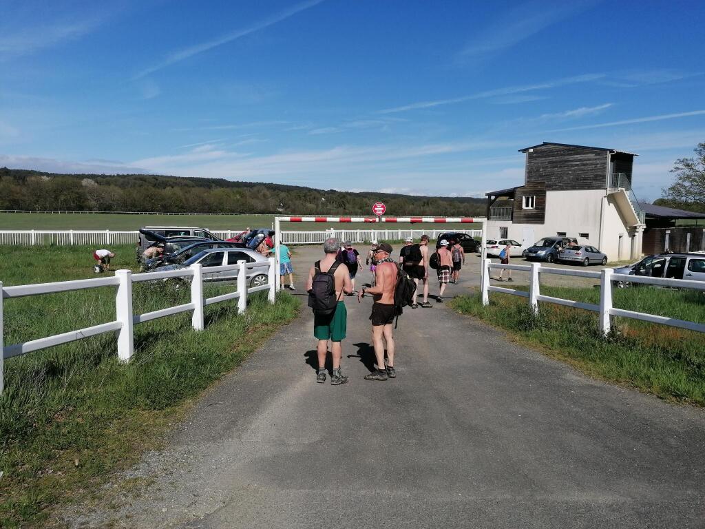 Je suis en avance au parking de l’hippodrome de Lestun, vite rejoint par Olivier qui me fait un rapide rappel des usages et précautions à prendre. Et rapidement nous voici à 27 prêts pour la rando. Dominique me présente les uns et les autres mais j’oublie vite les prénoms. Et nous voilà partis bien vêtus car la température est fraîche. Nous commençons à nous mettre à l’aise dès l’entrée du bois mais prudence car nous traversons un hameau et rencontrons des promeneuses.