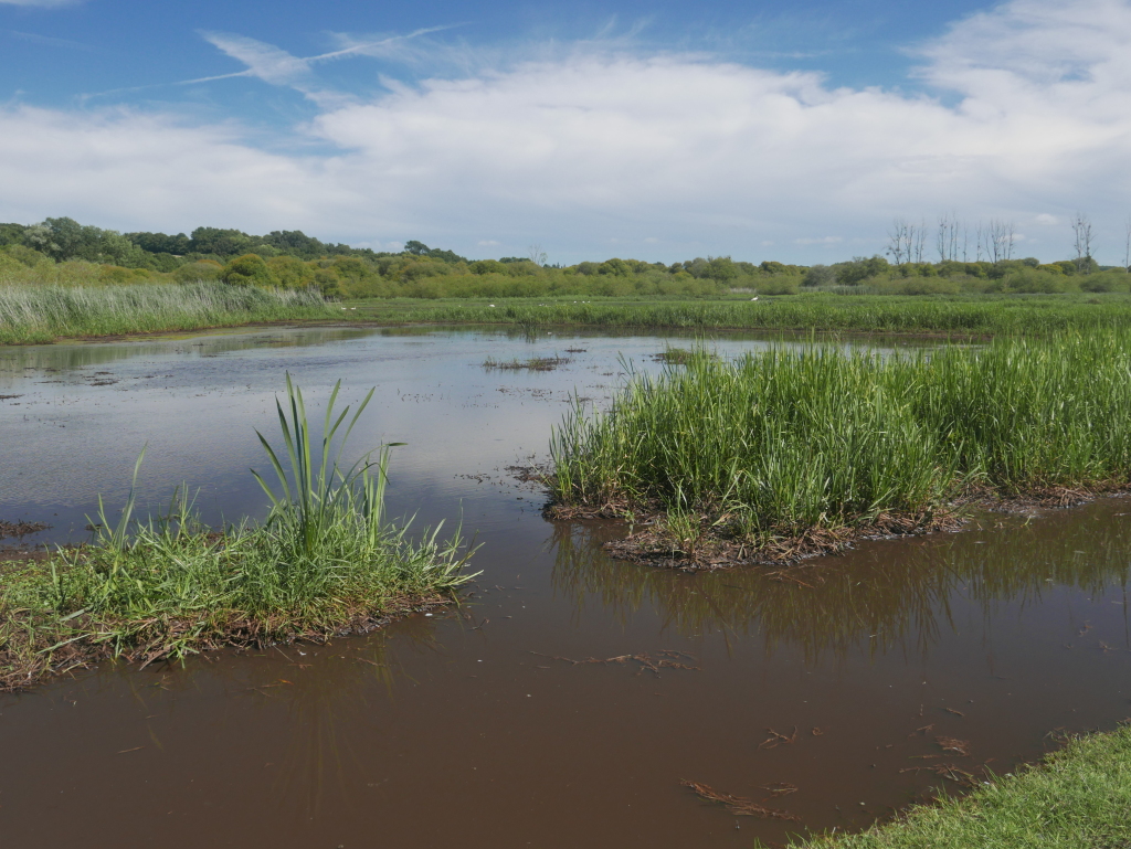 On a quitté le chemin principal juste avant quelques habitations afin de passer sur une longue passerelle au-dessus du marais. Par la suite il y avait un tronçon tout près d'une route, heureusement peu fréquentée, et on a aussi fait un petit détour pour voir un "mur d'observation" avec des fenêtres par lesquelles on pouvait observer les oiseaux sans les perturber. Sauf que des oiseaux, il n'y en avait pas.