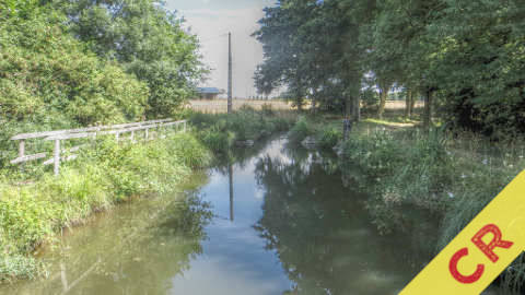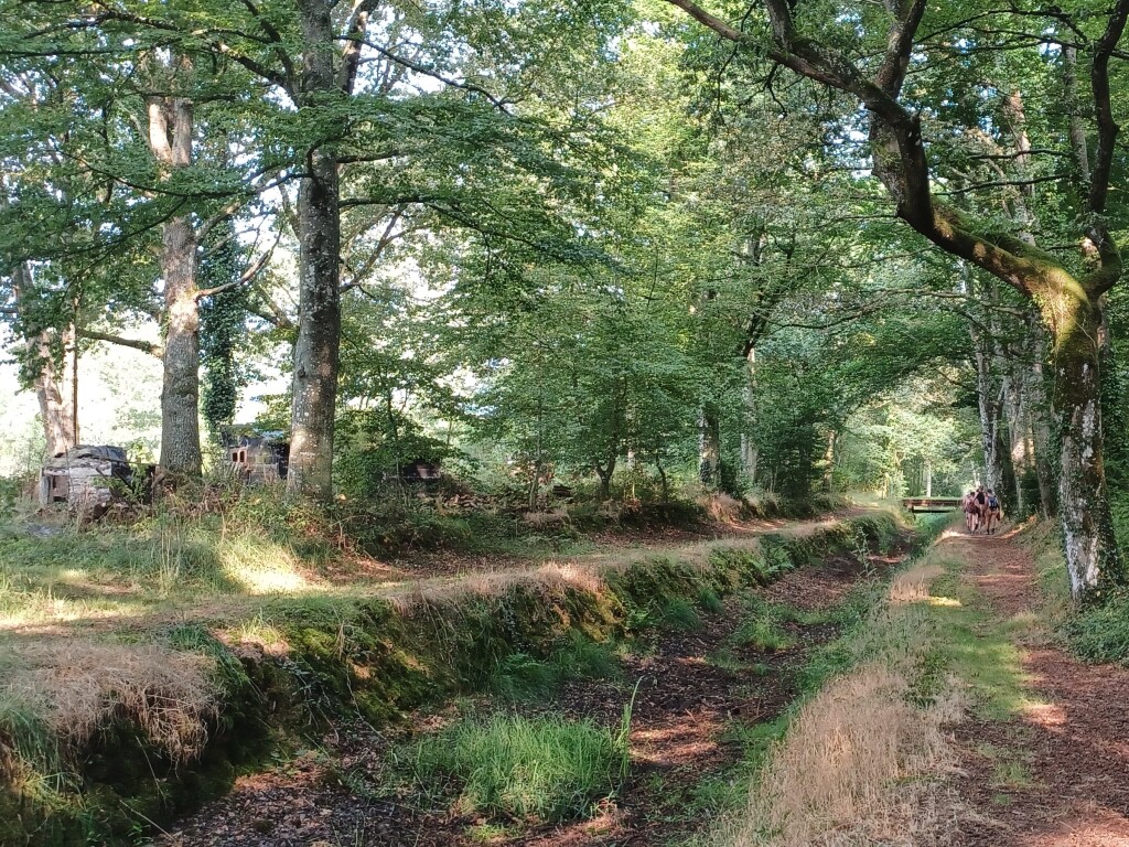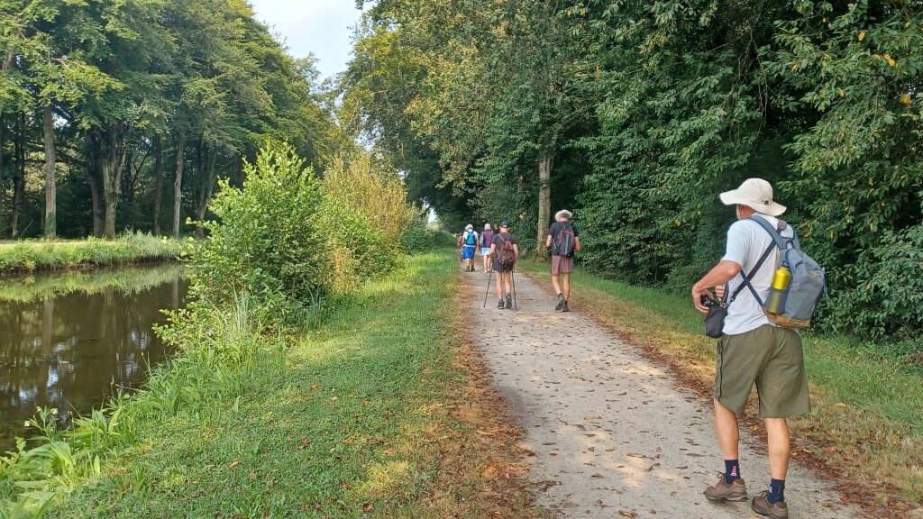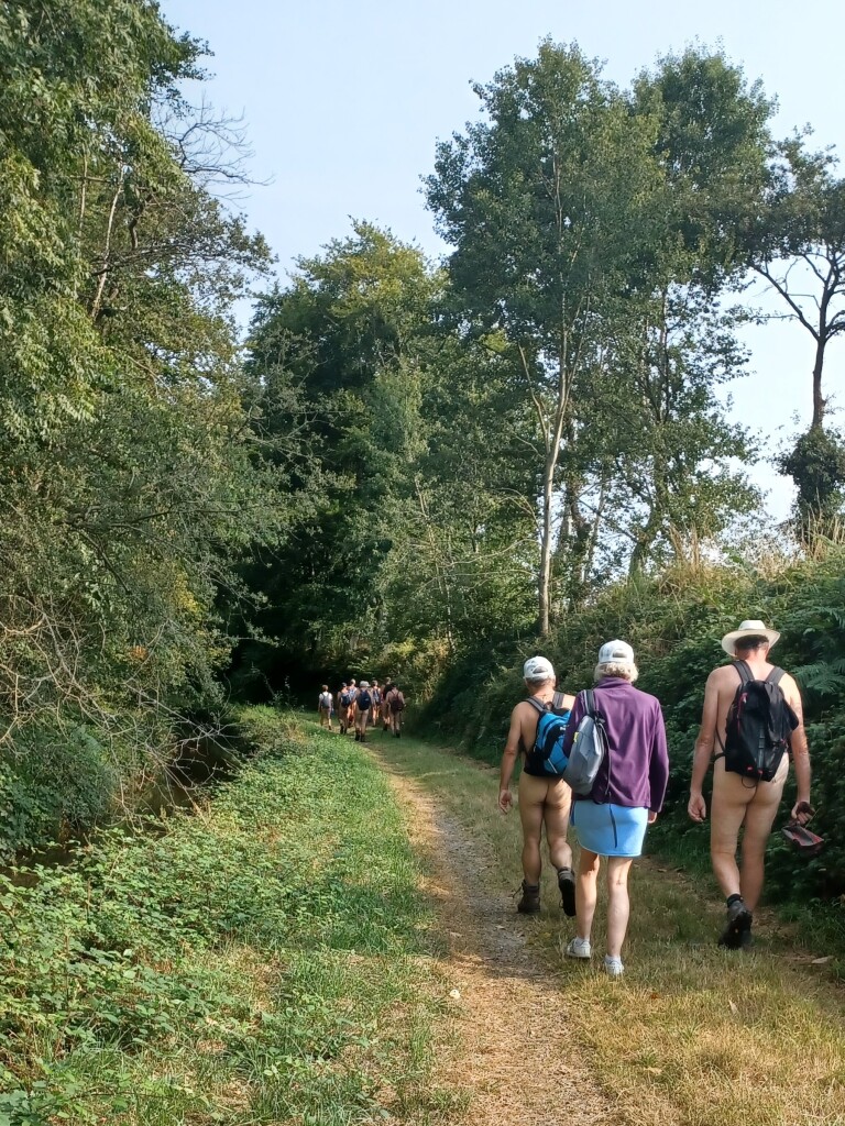 Cette première partie se fait en textile car nous croisons de nombreux cyclistes, ce qui était à prévoir car nous ne sommes que le 19 août et pour beaucoup ce sont encore les vacances. Bref, enfin nous bifurquons à droite en face du parking de départ pour emprunter la rigole en tenue d’Adam et d’Eve. Nous suivons cette rigole qui fuit, dans la campagne, en ligne droite sur plusieurs kilomètres (soit dit en passant elle est large comme un petit canal à sec - c’est l’été – et totalement à l’abandon car envahie par des branchages et toute sorte d’herbes).