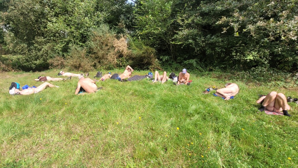 Enfin nous nous posons dans une prairie, au soleil, pour pique-niquer… moment délicieux que nous apprécions tous au bout de 8 kilomètres. La sieste faite, nous repartons à travers champs et bois avec quelques rhabillages au passage de maisons et lorsque nous traversons des routes, d’ailleurs peu fréquentées… mais on en sait jamais « chat échaudé craint l’eau froide»...