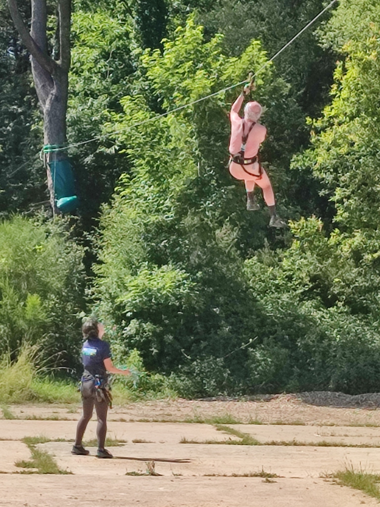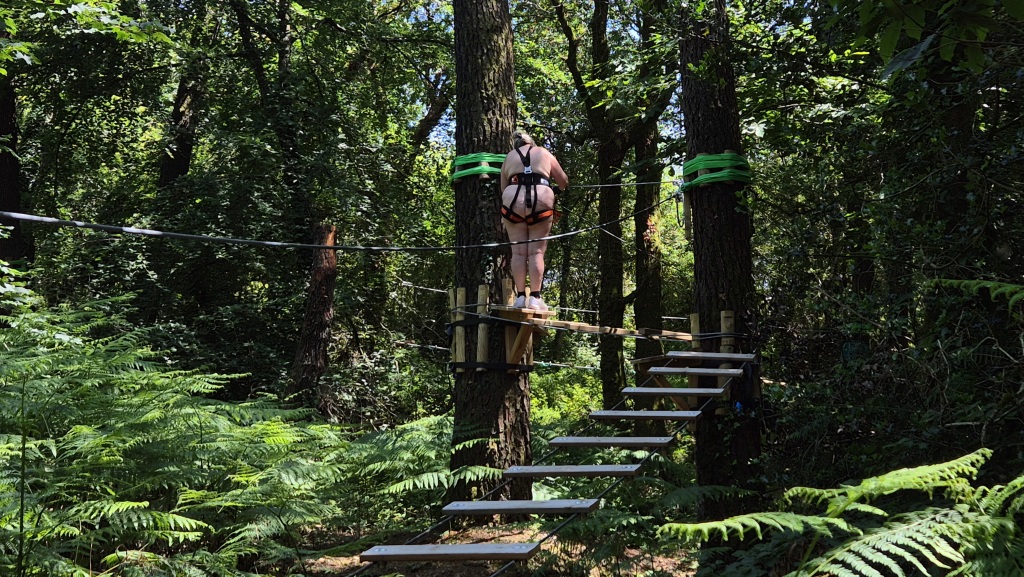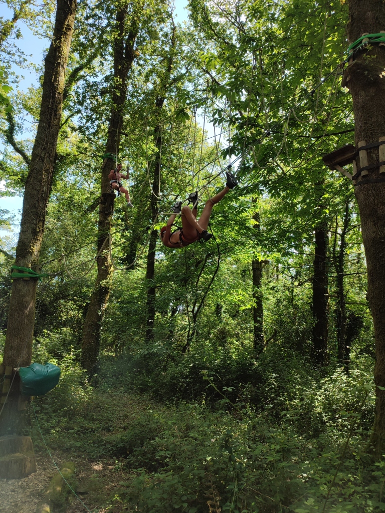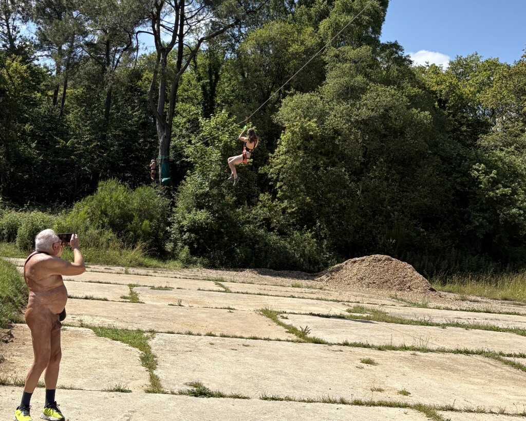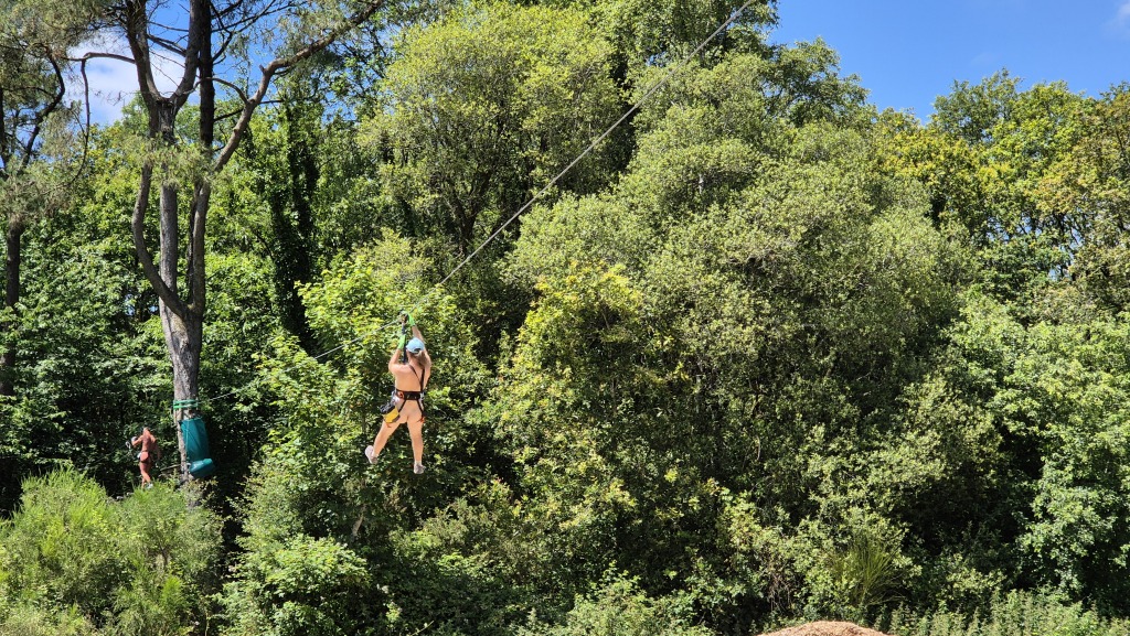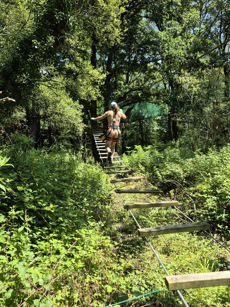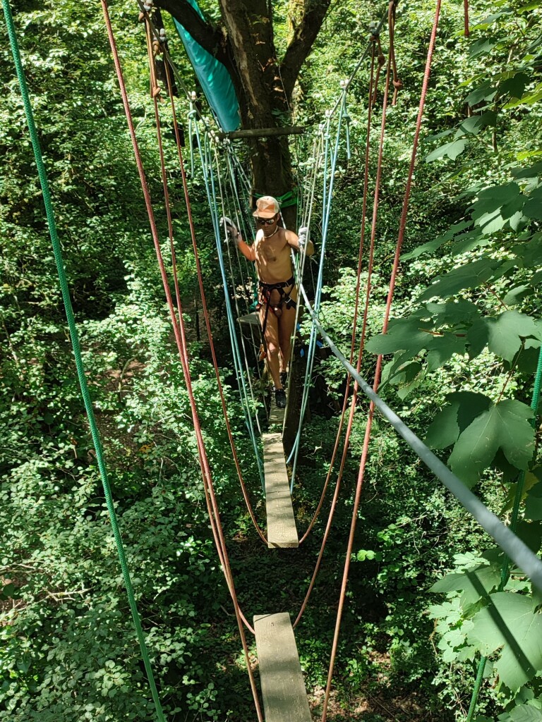 Quand j'ai fini, l'assistante me conseille de faire la grande tyrolienne, l'approche n'étant pas très compliquée. Tout est relatif bien sûr et me voilà presque tétanisé tout en haut sur le dernier pont d'approche de la platforme. Là j'ai bien eu peur de lâcher et de devoir faire appel à l'équipe de sauvetage. Mais j'y arrive. La tyrolienne proprement dite n'est pas un problème, elle n'est pas très rapide, il suffit de se laisser aller. Mais au bout je ne réussis pas à choper la corde d'arrivée et me voilà reparti en arrière. Il faut tirer sur le cable pour monter à la main. La force me manque, trop fatigué déjà. Heureusement il y a la secouriste qui me lance une corde et me tire jusqu'au bout.