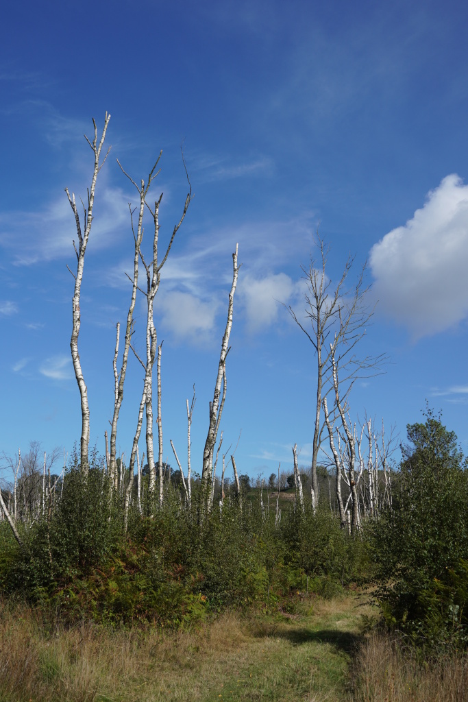 Cette randonue hors des sentiers battus nous a fait traverser des zones dévastées par les multiples incendies des ces dernières années et du dernier en date de cet été tout proche de Tréhorenteuc, paysages de désolation avec tous ces troncs figés sans vie.