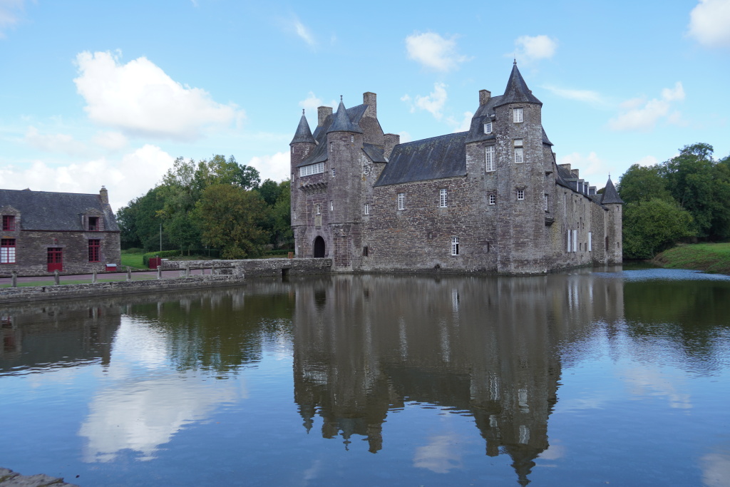 La suite nous amène vers des toits donc la civilisation et un autre lieu visitable: le Château de Trécesson qui a conservé son aspect médiéval, début construction 14ème, fin 15ème siècles, se reflète dans l'étang qui l'entoure sur une partie, un château plein de légendes où nous ne croiserons pas la Dame Blanche, c'est bien trop tôt dans la journée. Tôt pour la Dame mais déjà bien avancé pour nos estomacs alors nous décidons de repartir vers la lande déserte de monde, c'est quand même nus comme des vers que nous sommes censés nous déplacer comme aussi se poser pour une pause pique-nique bien méritée dans un champ. Oh là!! Mais ce n'est pas le club med, juste à la moitié de notre périple la remise en piste est donnée par Paul.