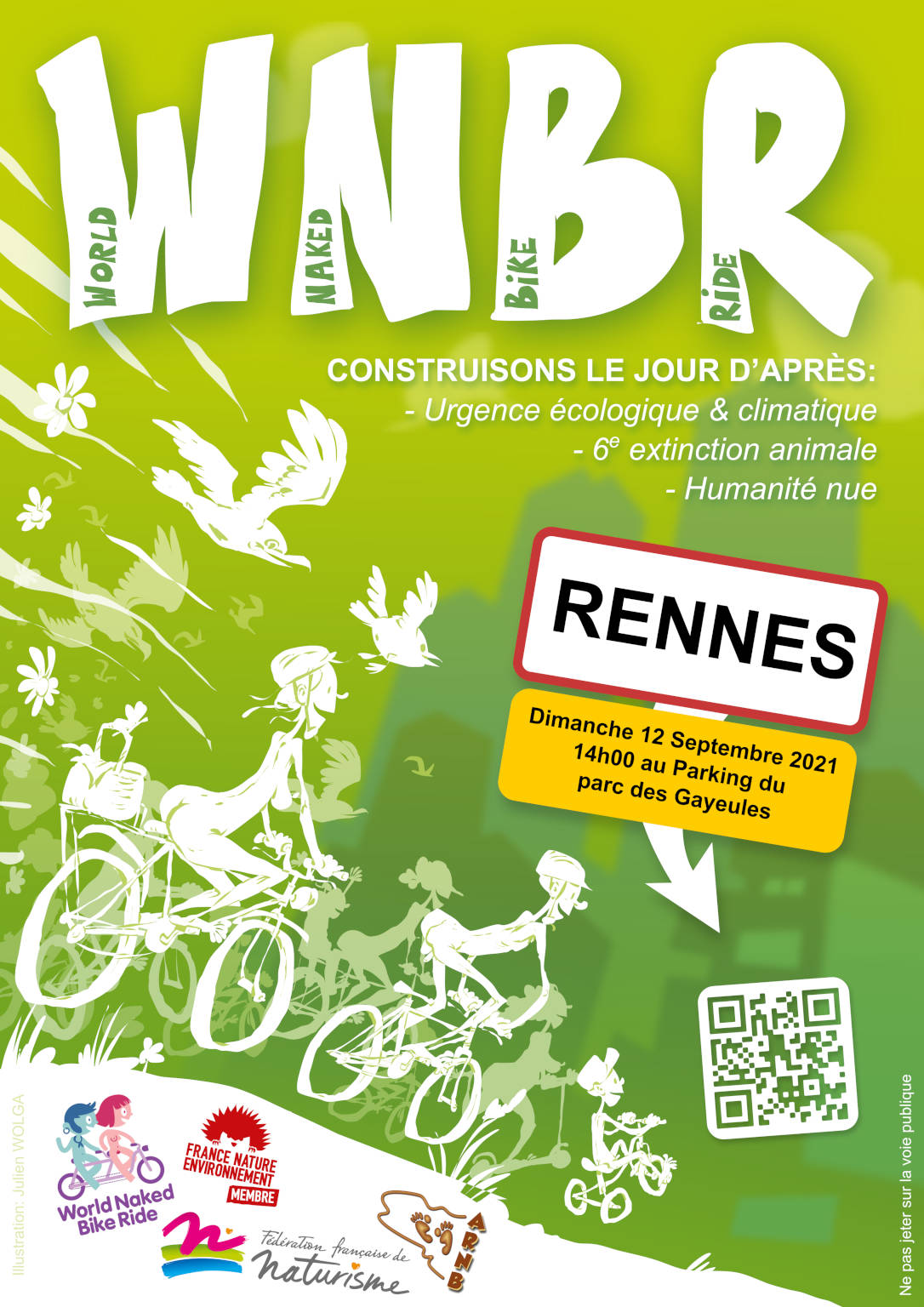 La Fédération française de naturisme vous donnent rendez-vous le dimanche 12 septembre 2021 à Rennes, pour une manifestation qui consistera en une circulation, festive, familiale et pacifique à vélo, rollers, skateboard ou trottinette sur un parcours dédié.