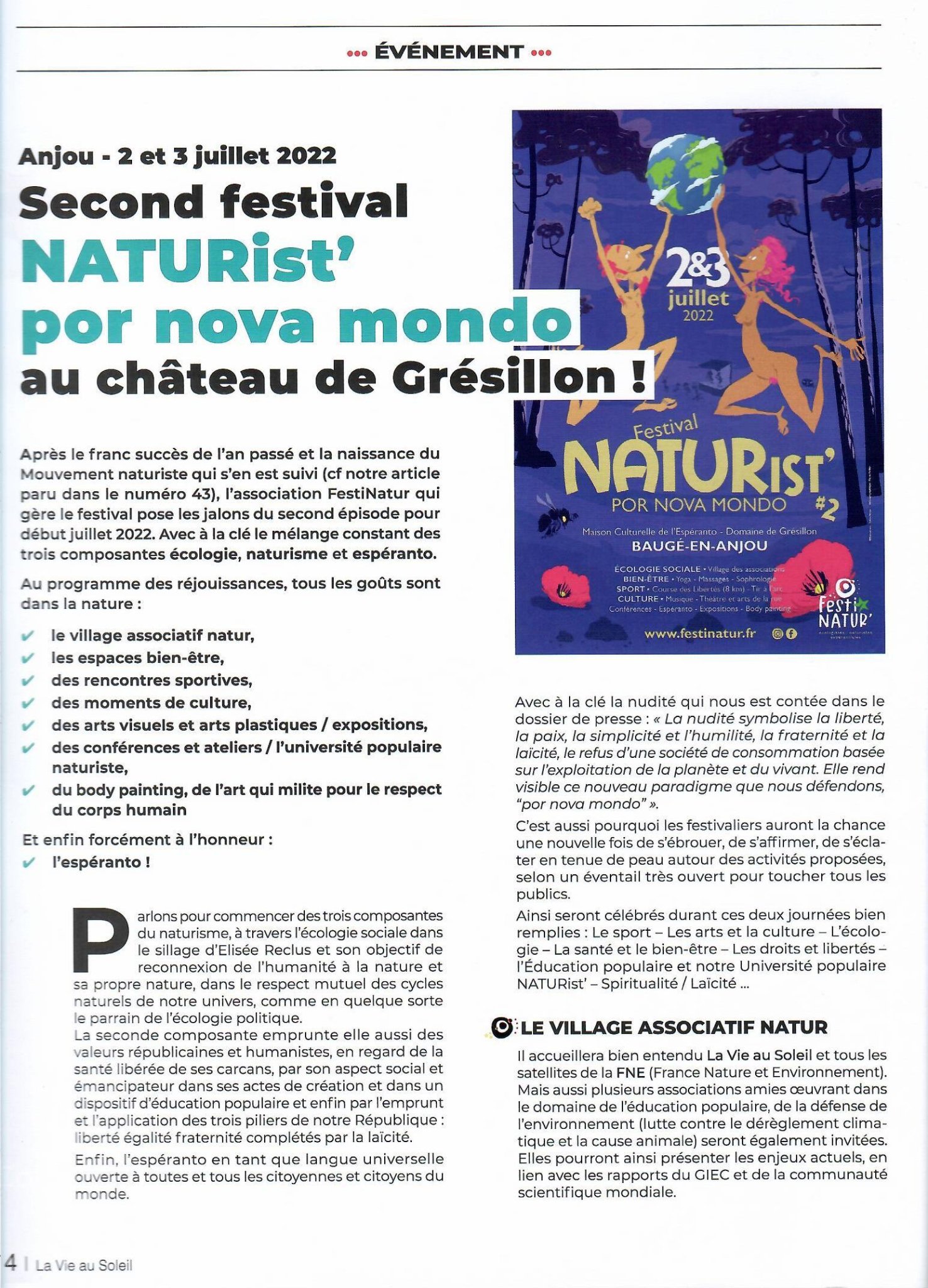 Dans le 𝐍°𝟒𝟒 de La Vie au Soleil, un article de Franck Dit Bart sur la 2ème édition du Festival Natur'IST por Nova Mondo les 2 et 3 juillet prochains au château de Grésillon près d'Angers.